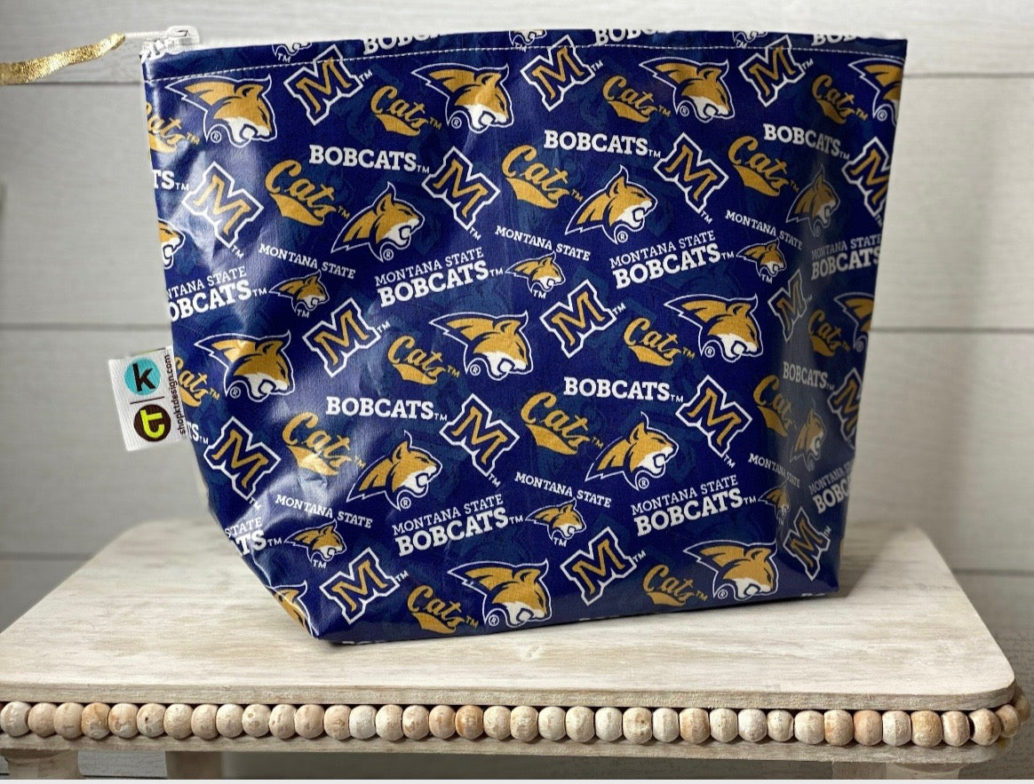 So cute and practical oilcloth and laminated cotton zip bag. Waterproof and wipeable inside and out. Thick plastic zipper and large base so bag stands open.